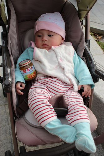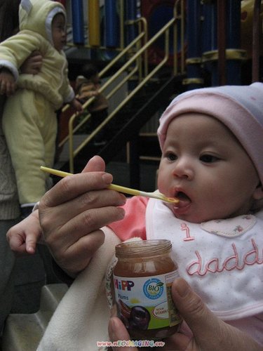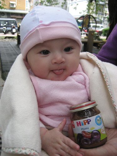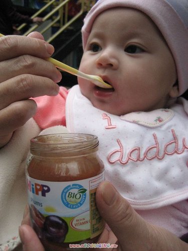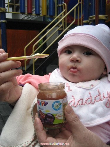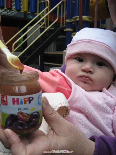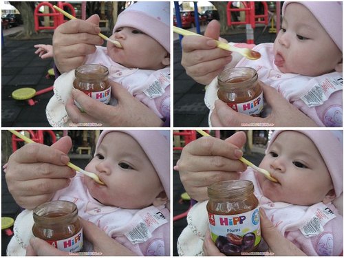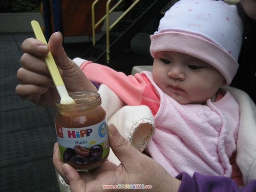 1/29帶著Chloe到住家附近的公園走走溜搭溜搭...才剛拿出HIPP喜寶的有機黑棗泥PLUMS,Chloe就很俏皮的吐個舌頭裝可愛