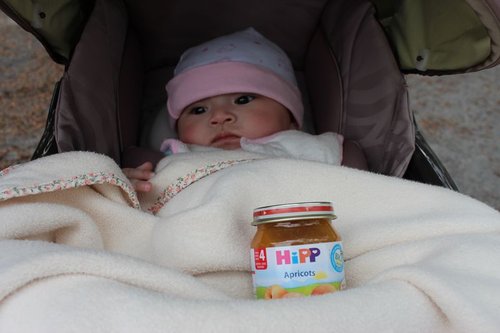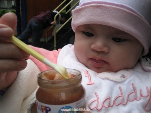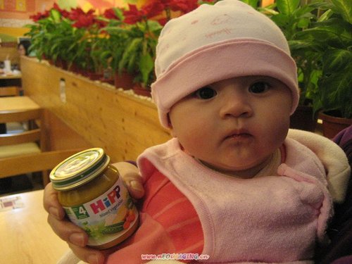 Chloe開始嘴巴蠕動的時候,就是肚子餓了想吃點東西,這時候又剛好是喝奶時間與喝奶時間的空檔,我就會拿出方便的HIPP有機泥來填填她的肚子先。