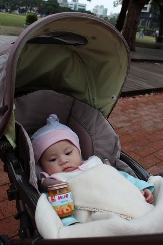 初五台中的天氣還算不錯,帶著Chloe外出透透氣,到住家附近的誠品逛逛,旁邊就有個小公園,這時候Chloe肚子餓的時候,還有點心時間,就可以拿出方便又健康的HIPP蔬菜&水果泥出來。
