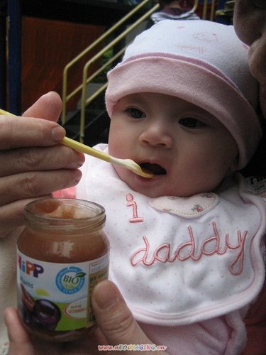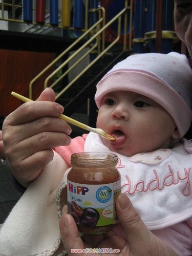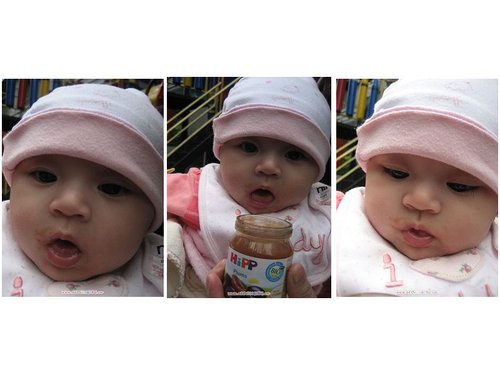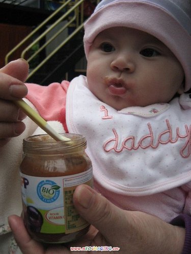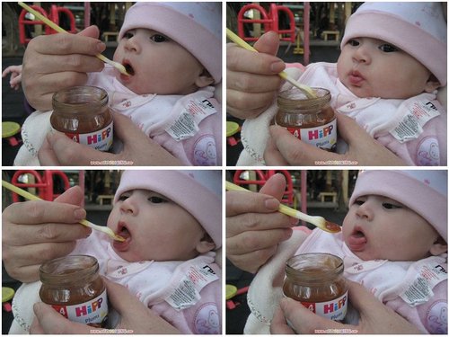 她會自己用超級強吸力嘴,把HIPP的黑棗水果泥吸入口中,捲屈的嘴巴和舌頭,彷彿就像咕嚕.咕嚕的吞著,也沒有人教她這樣做