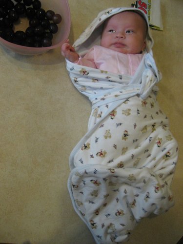 Chloe要出門囉,我們怕外面和醫院有些冷,所以還是給她包個包巾,沒想到原本的包巾現在包起來,Chloe感覺像個巨嬰ㄧ樣,包巾根本包不住嘛!手已經跑出外面來,兩腳也一直踢踢,沒想到才一個多月,體重的增加這麼快速,我們把她放在餐桌上包起來,都覺得好好笑喔!