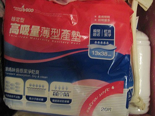 產墊方面,有的媽媽說帶自己之前月經來使用的衛生棉就可以,帶超厚型或是加長型的衛生棉,所以我就準備一些之前沒用完的衛生棉。